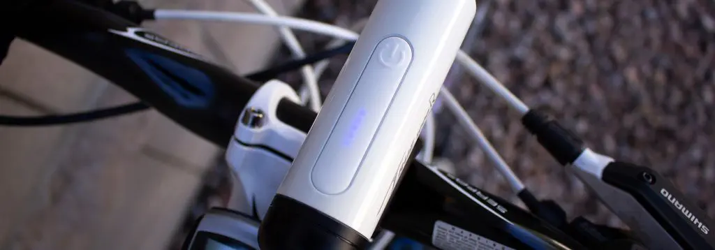 Rugged MTB stylized design aesthetic; front aluminum heatsink, rear polymer housing.