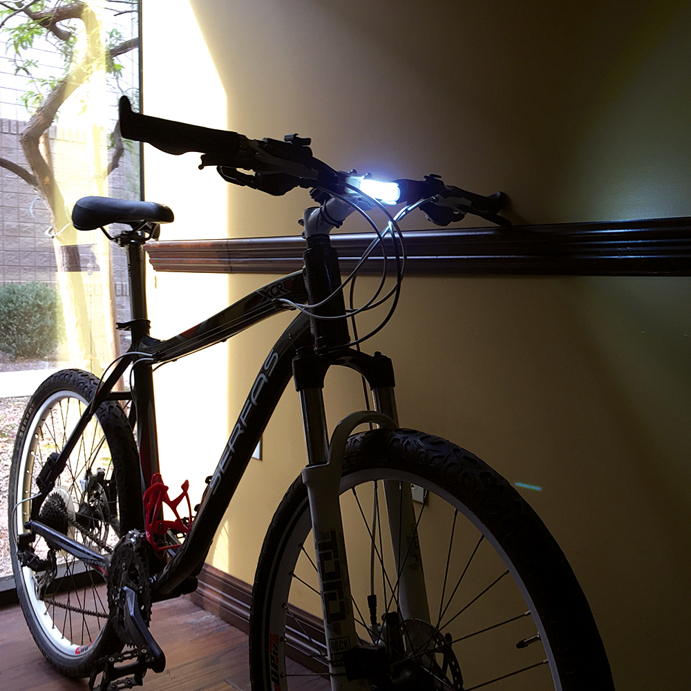 I mounted this through the air flow on the front of my bike helmet so that it would illuminate the path wherever I turn my head. It doesn’t have a long focal throw, but it still did a great job. I ride on a golf course at night which tends to be windy, hilly, and dark. This helps me see a little farther down the path to where I’m going. At the same time I’ve got a handle bar mounted light that keeps the path lit. I wasn’t fully charged so the thunderbolt quit at about an hour on my first ride (full strength.) A longer battery life at full strength with be appreciated. And a warning/dimming as the battery drains would be helpful. At intersections I noticed people notice me. Great safe light!