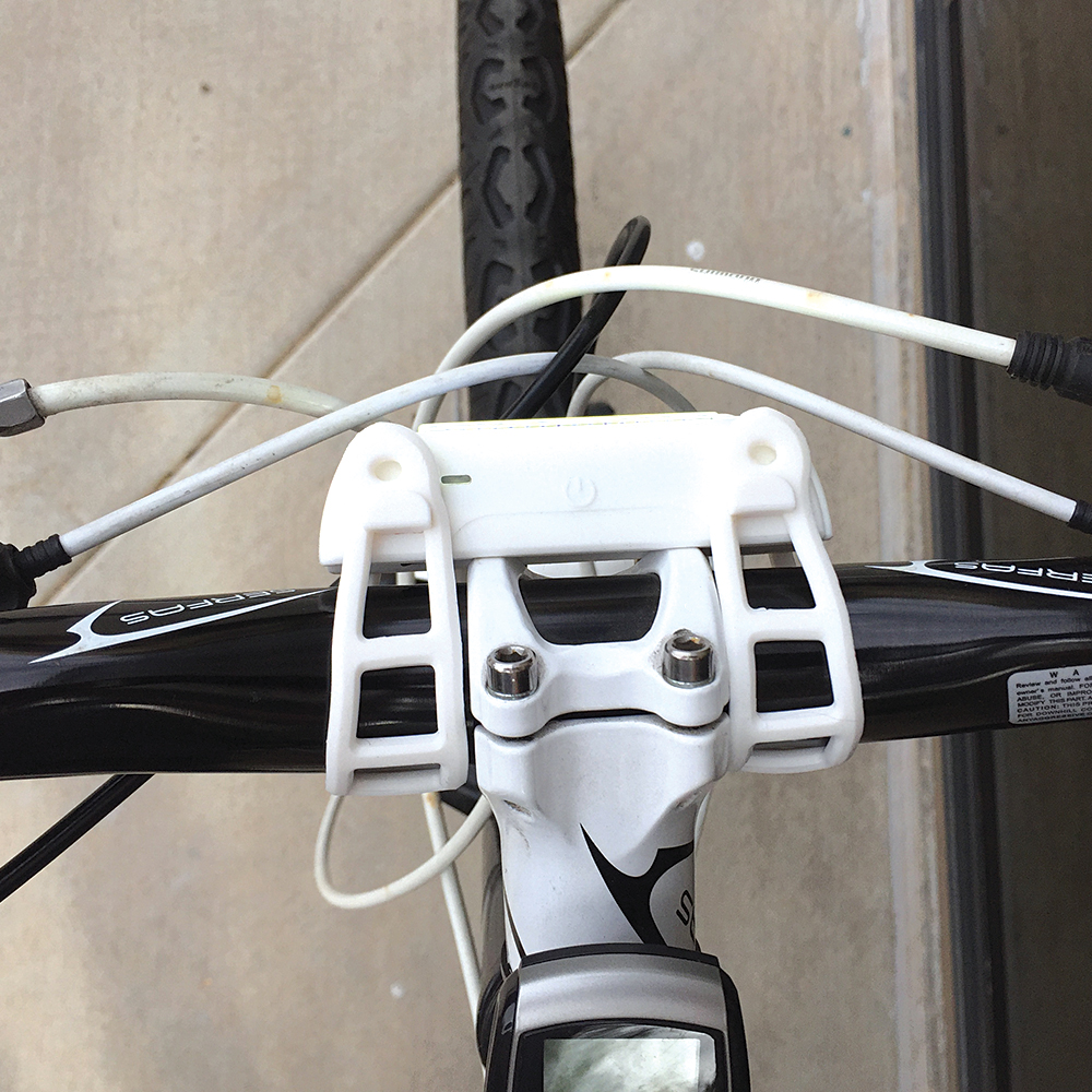 There’s nowhere on the handlebars on my bike that I can mount the light, and the head tube and front forks are both large enough I didn’t feel comfortable stretching the straps sufficiently to mount the light. In the end, I used a clamp on accessory mount I had sitting around to hold the light, and it works pretty well.