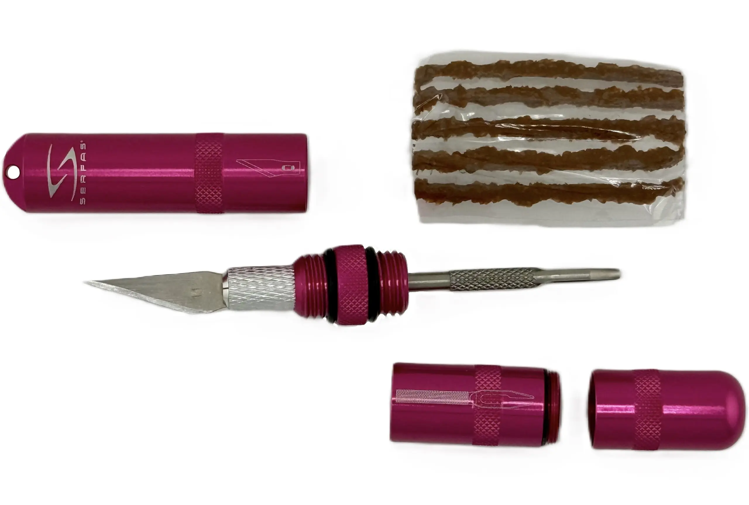 Everything needed to repair a tubeless tire puncture in a lightweight package.