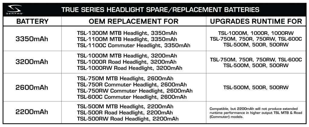 - Battery Options For 2019 True Series MTB & Road Headlights: